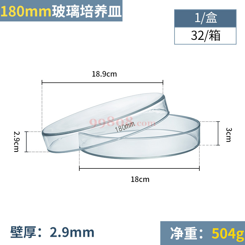 【别名】双碟、平板皿、双重皿、培养碟 【英文名】Petri culture dishes 【材质】高品质硼硅玻璃制品,有耐药性,溶出量少,可放心使用。 【规格】培养皿规格尺寸的计算,在国际上有两种不同的计算方法:一种方法是按皿盖计算,理由是在培养时使用恒温箱内进行培养,它可以计算恒温箱的体积可存放多少个培养皿;另一种计算方法是按照培养皿皿底计算,理由是在培养时可按照培养皿的皿底体积计算使用多少培养基。