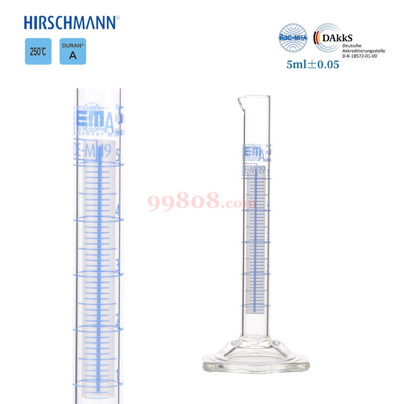 HIRSCHMANN/赫施曼 | 刻度量筒 DURAN A级 | 5ml±0.05ml 蓝白线 1个/盒