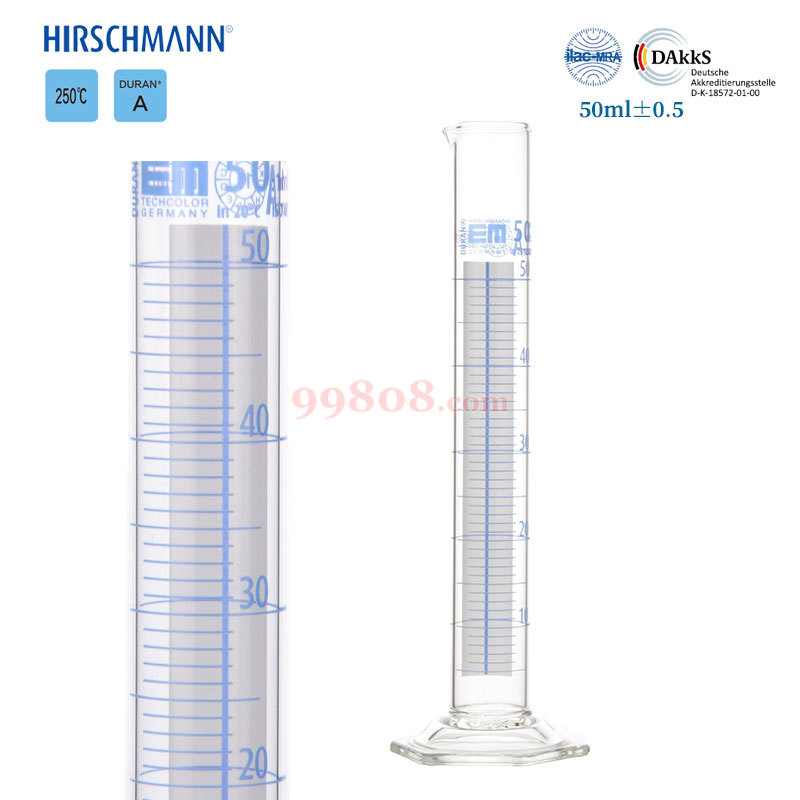 HIRSCHMANN/赫施曼 | 刻度量筒 DURAN A级 | 50ml ±0.5ml 蓝白线 2个/盒