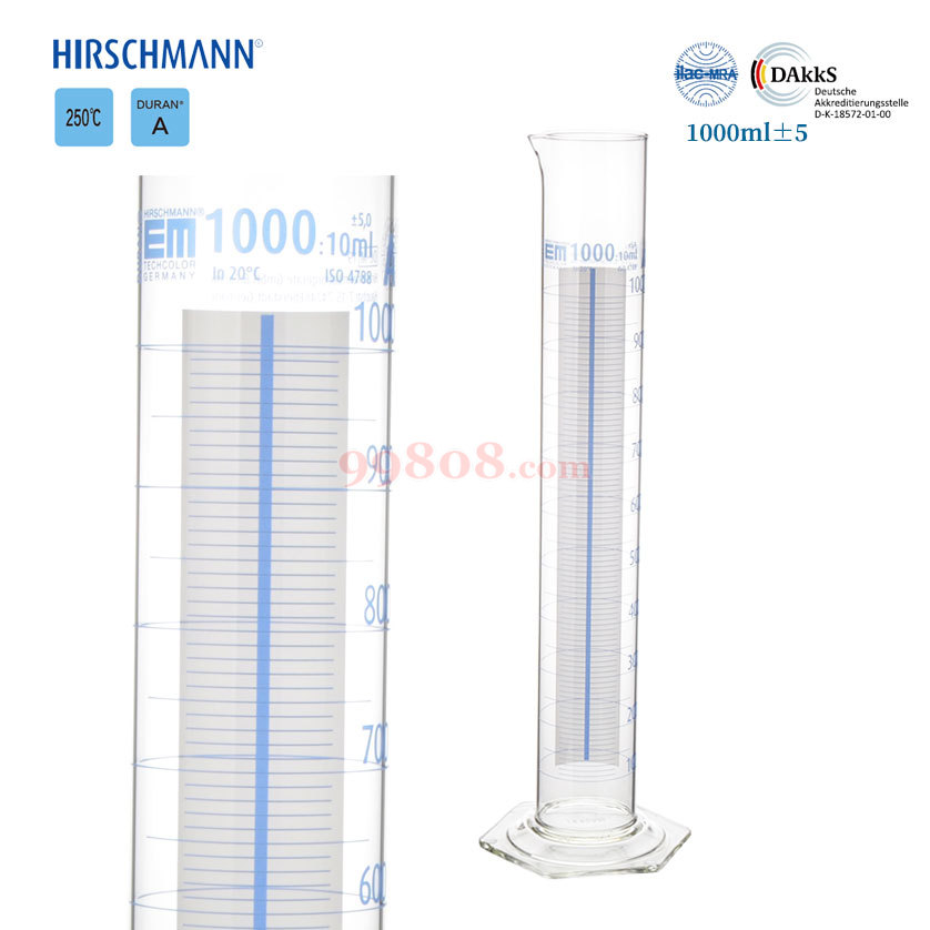 HIRSCHMANN/赫施曼 | 刻度量筒 DURAN A级 | 1000ml ±5.0ml 蓝白线 1个/盒