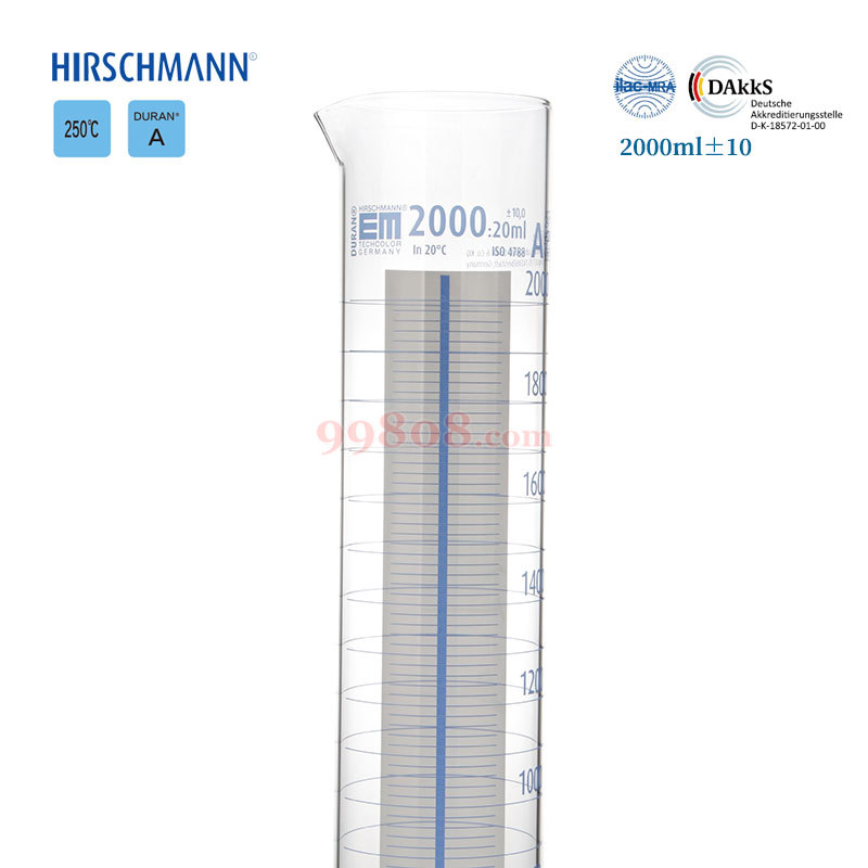 HIRSCHMANN/赫施曼 | 刻度量筒 DURAN A级 | 2000ml ±10.0ml 蓝白线 1个/盒