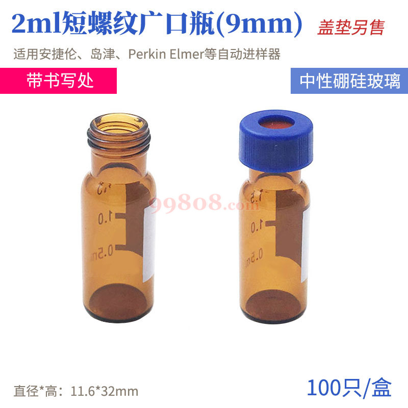 适用于下列品牌仪器: Agilent、Waters、Thermo Scientific、Beckman、CTC、Gilson、Knauer、Shimadzu、Spark、Varian、VWR (Merck)/Hitachi、PerkinElmer等。 9mm短螺纹广口样品瓶 *国际通用能普遍兼容于市场面上所有常规自动进样器 *带书写的样品瓶提供带刻度的书写标签方便识别样品 *采用短螺纹高领脖的方式使其更容易被自动进样器抓取 *普遍采用高品质进口5.0硼硅盐酸玻管制造除此...