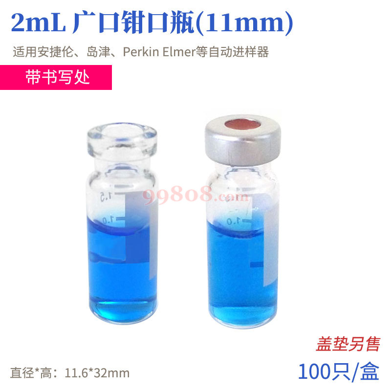 适用于下列品牌仪器 ★兼容所有2mL样品瓶自动进样器 Agilent、Waters、Thermo Scientific、Beckman、CTC、Gilson、Knauer、Shimadzu、Spark、Varian、VWR (Merck)/Hitachi、PerkinElmer等。 2mL、11.6x32mm.11X1mm特氟龙/ 硅胶隔垫11mm 钳口样品瓶和微量内插管、气相/液相小瓶 *宽颈口设计,便于灌装,适用于6mm直径的内插管 *带书写的样品瓶提供带刻度的书写标签,方便识别样...