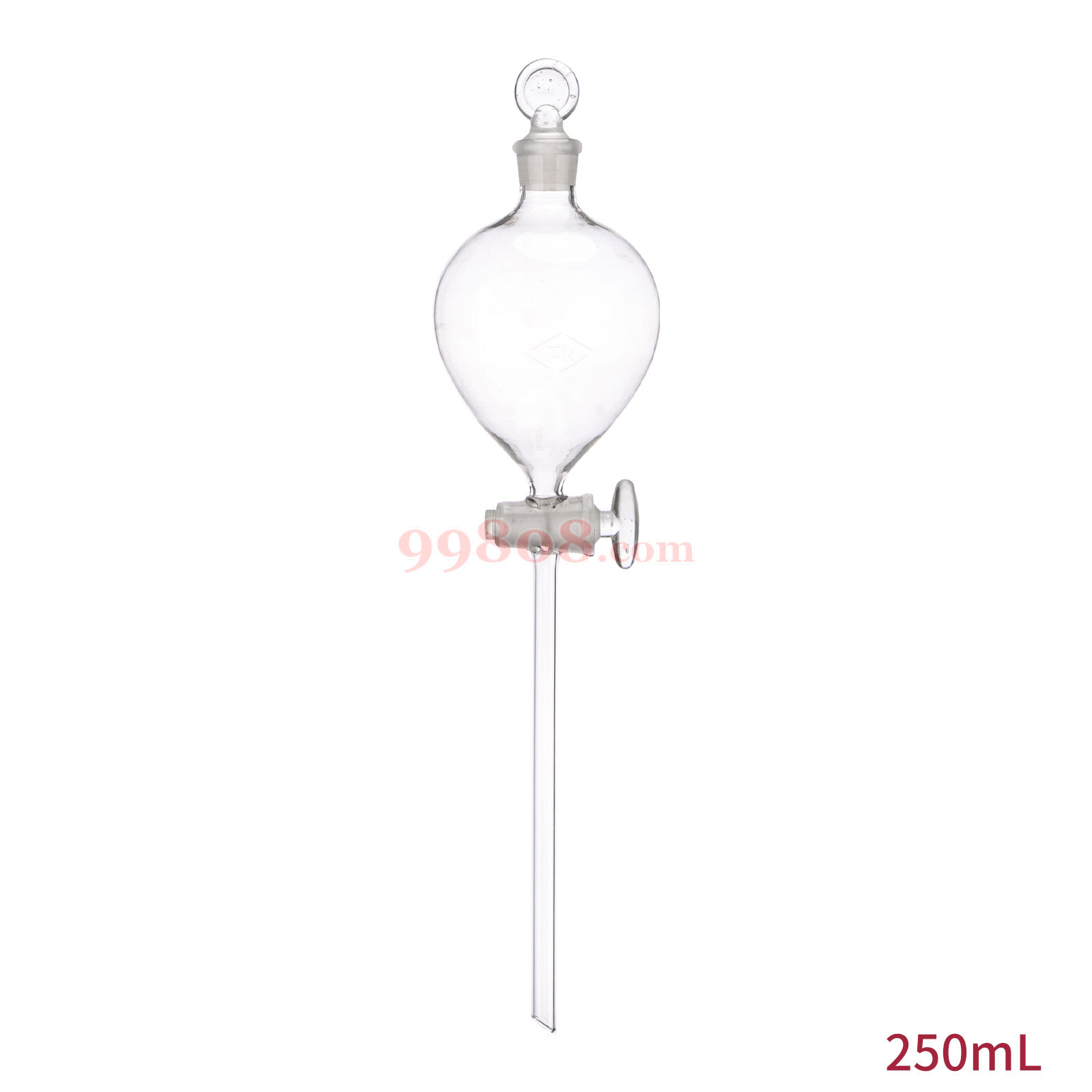 球形分液漏斗主体是一只圆球,上端具有磨砂玻璃塞,下端焊有两通活塞及漏斗管柄。由于球形的直径较同规格的梨形、筒形分液漏斗的直径大,故在操作时液体容易摇匀,速度快。同样由于球形直径大,在分层后的液体分离层较难掌握。 用途:分层,加液用。球状在分离萃取振荡时,液体翻腾较梨形速度快,但放液操作时,要小心些。做萃取实验时,溶液易产生气体,晃动两三下以后,请注意及时放气,以免发生炸裂。