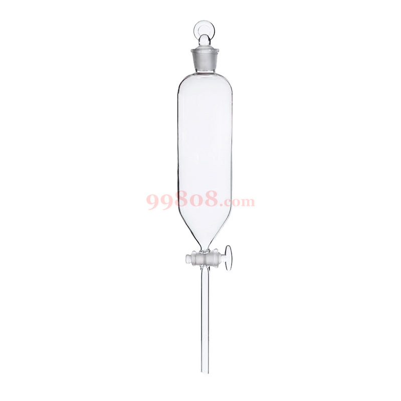 筒形分液漏斗主体是一只细长的垂直圆筒形的玻璃筒,在筒身的上端具有玻璃磨砂塞的瓶口,下端配二通活塞和漏斗管柄。由于它瓶身为细长的筒形,所以在分层分离时较梨形还容易控制。常用于合成反应操作上与多口烧瓶配合作为加液用的器具。特别在组成回流搅拌的合成分层装置时,由于多口烧瓶的球面积少,筒形分液漏斗是细长的主体,占用的球面积亦少,故更为适用。本器常用于合成反应作加液用的器具,也可作萃取分离器用。做萃取实验时,溶液易产生气体,晃动两三下以后,请注意及时放气,以免发生炸裂。