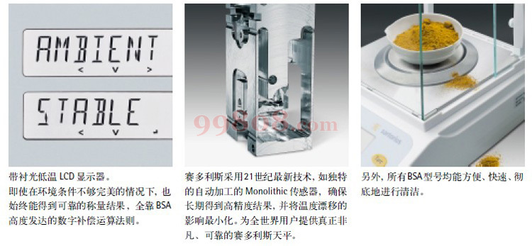 【新技术】高分辨率的应用程序中集中了更多功能:1mg-620g和10mg-6200g。赛多利斯将尖端技术和合理成本合而为一,创造了Γ新的卓越等级。BSA系列拥有Γ新Γ强大的微处理器技术,缩短响应时间,得到更快速的结果。即使在环境条件不够完美的情况下,也始终能得到可靠的称量结果,全靠高度发达的数字补偿运算法则。