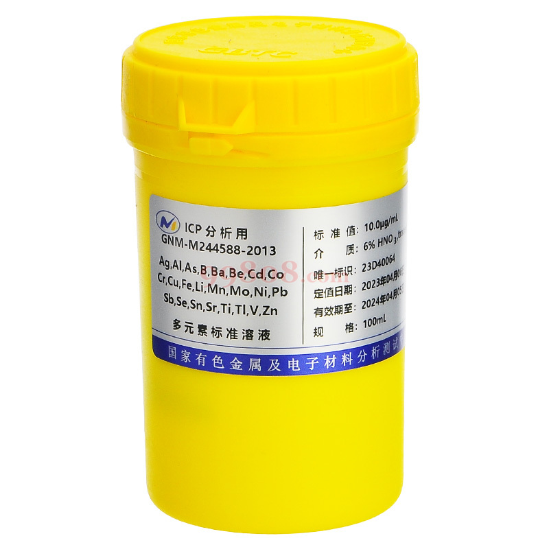 | 521250 | Al, As, B, Ba, Be, Bi, Cd, Co, Cr, Cu, Fe, Ga, Li, Mg, Mn, Mo, Ni, Pb, Sb, Sn, Sr, Tl, V, Zn 1000µg/mL | 100mL/瓶 | GNM-M241041-2013 | 有色金属研究总院 | 起售:1 批量:1 | 瓶 | ¥1800.00/瓶 |