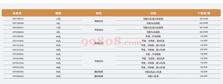 | 7694 | 96孔 中结合力可拆 配12孔条 | 10块/盒;200块/箱 | FEP201296 | JETBIOFIL/洁特 | 起售:1 批量:1 | 箱 | ¥1082.00/箱 | ||