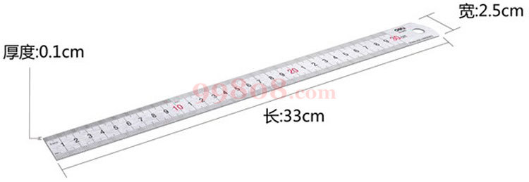● 厚度:0.1cm;规格:30cm,50cm 材质:不锈钢 ● 文字采用两色印刷,双色标记 ● 量程式刻的,清晰、精确、耐磨 ● 背面刻有众多公式或换算表,便于查找核对 ● 表面亚光处理,美观耐用,表面不易反光