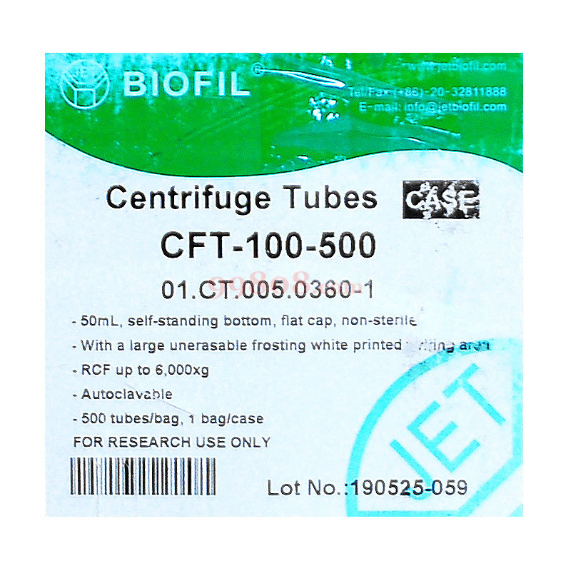 | 8080 | 50ml 锥形底;大包装;未消毒 | 500支/袋;500支/箱 | CFT000500 | JETBIOFIL/洁特 | 起售:1 批量:1 | 箱 | ¥465.00/箱 | ||