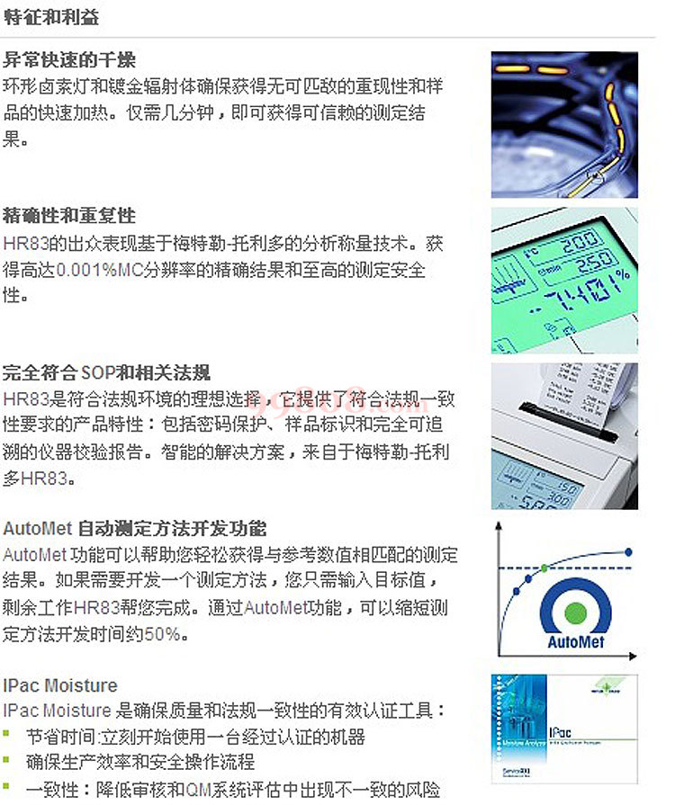 适用于研究开发和法规环境要求的专业解决方案。不论您需要分析何种样品,HR83都将提供满足您期望的、来自梅特勒-托利多仪器的分析能力。可读性0.001%,密码保护和可追溯的样品标识,HR83为您提供安全和可存档的测定结果,获得完全的法规的一致性;而独特的AutoMet功能,加速您的测定方法开发,进而提高您的生产效率。