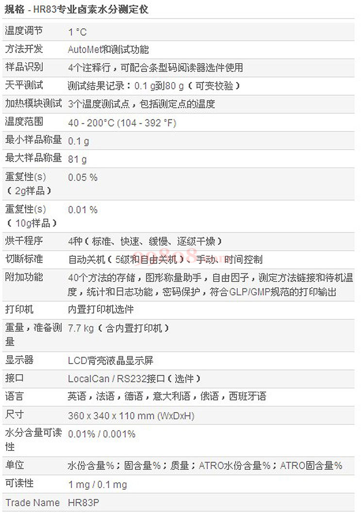 规格:HR83 专业卤素水分测定仪