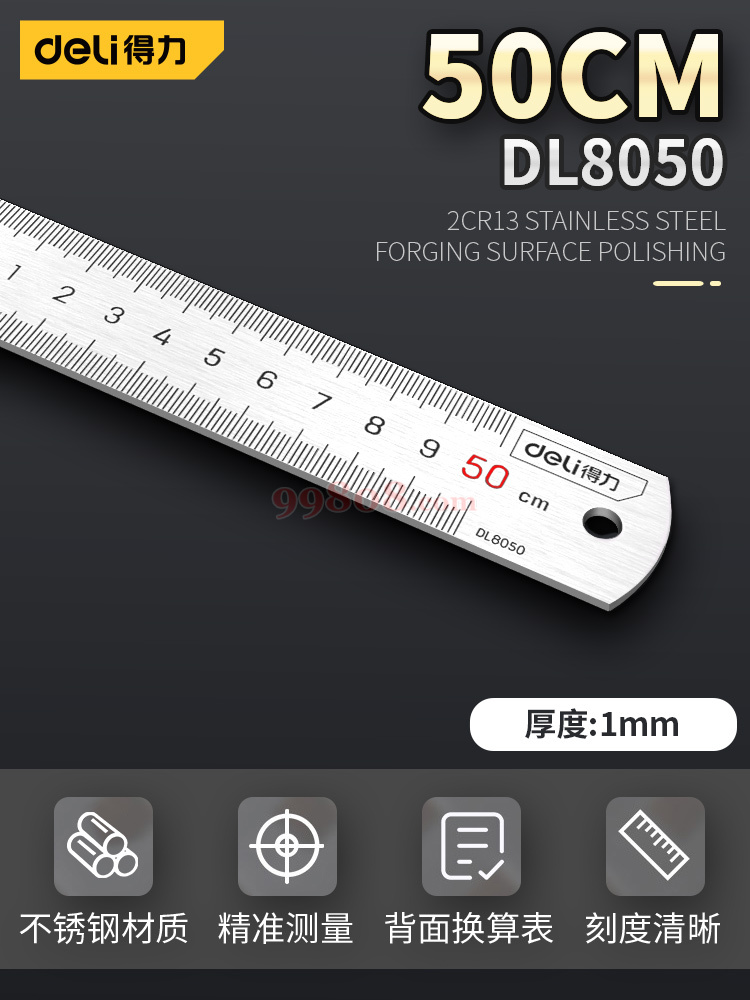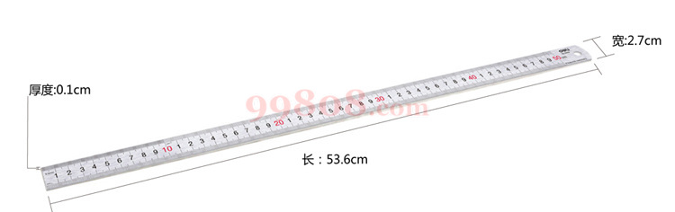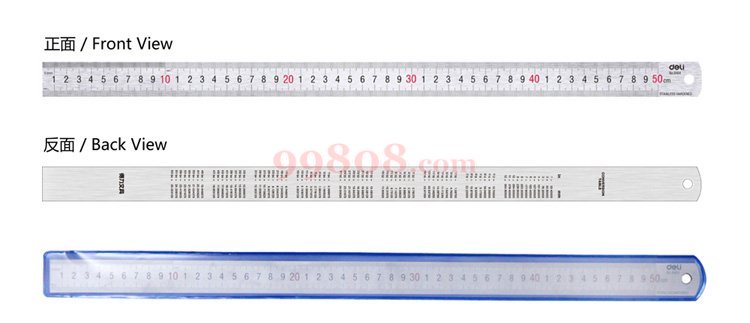● 厚度:0.1cm;规格:30cm,50cm 材质:不锈钢 ● 文字采用两色印刷,双色标记 ● 量程式刻的,清晰、精确、耐磨 ● 背面刻有众多公式或换算表,便于查找核对 ● 表面亚光处理,美观耐用,表面不易反光