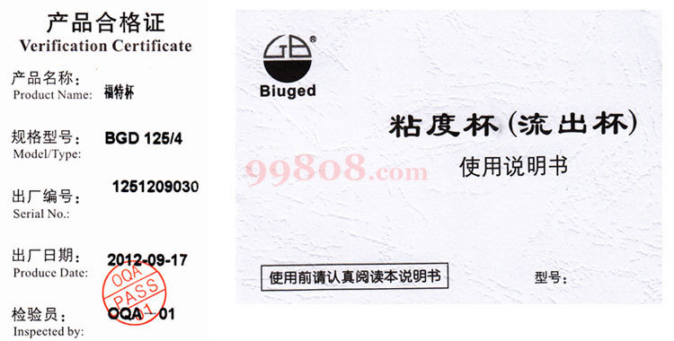 福特(Ford)杯按美国材料试验学会油漆及原材料标准ASTM D 1200,D333,D365中规定制作,用来测定油墨、涂料、油漆等粘性比较方便的粘度计。