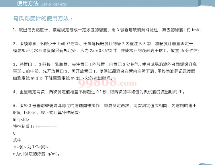 使用前必需将粘度计洗净,一般先用能溶解粘度计内残留物的溶剂反复洗涤,再用酒精或汽油洗,然后用发烟硫酸洗或重铬钾洗液浸2-3小时,Γ后用自来水冲洗,蒸馏水冲一下,放放烘箱,升温至150℃左右即可,或在自然温度下倒置数天,蒸干为止。