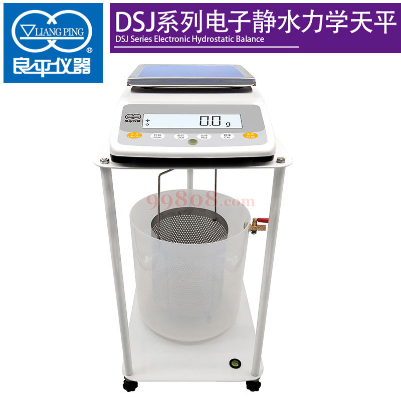DSJ系列电子静水力学天平配置及特点:一体式结构,秤盘组件,玻璃缸及不锈钢吊篮,交直流两用。