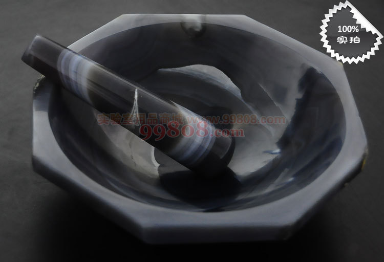 玛瑙研钵,主要用于实验室对少量样本的研磨或固体粉料混合均匀,非工艺品,质量是以保证可正常使用研磨为前提。质量鉴定标准:产品内膛口部至底部中心深度三分之一以内允许有裂纹一处。产品允许有外痕存在。完美主义者请勿拍