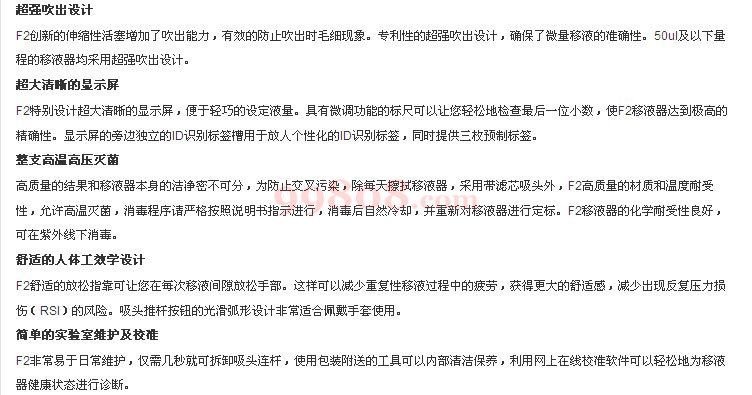 集时尚与经典于一身的F2移液器,秉承40年深厚产品底蕴,以其性能精准,使用舒适和设计时尚而深受广大用户喜爱。无论是轻巧移液,超轻吸头推出,还是经典的超强吹出以及卓越的移液精准性都体现了以人为本的设计理念。强大的在线校准软件和有效的售后服务体系,使其成为您值得信任的移液器助手。 主要客户类型包括:医药和生物公司,医院和临床诊断实验室,大学、科研院所和政府机构,以及环境与工业过程控制装备制造商等。