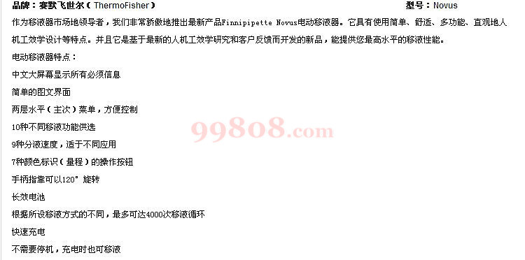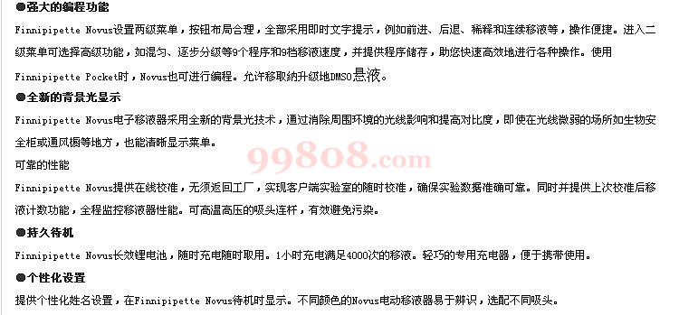 Finnipipette Novus电动移液器。它具有使用简单、舒适、多功能、直观地人机工效学设计等特点。并且它是基于Γ新的人机工效学研究和客户反馈而开发的新品,能提供您Γ高水平的移液性能。