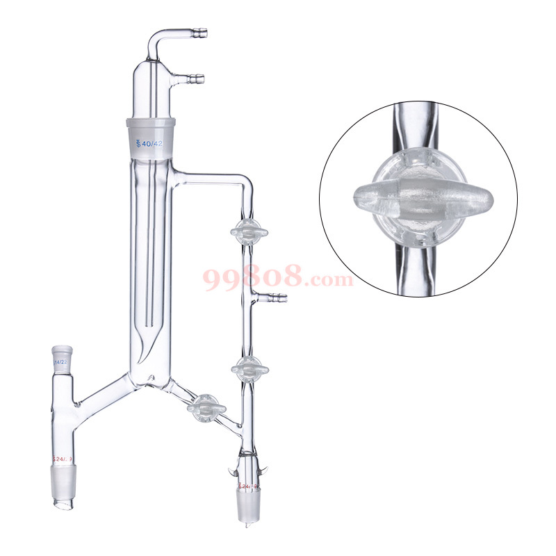 该蒸馏头由两个部件组成,结构较简单,能在减压情况下调换接受瓶。回流比用活塞控制,也可转动冷凝管来控制回流的比例,全部为标准磨口。主塞编号*边塞编号*边口编号*主口编号。