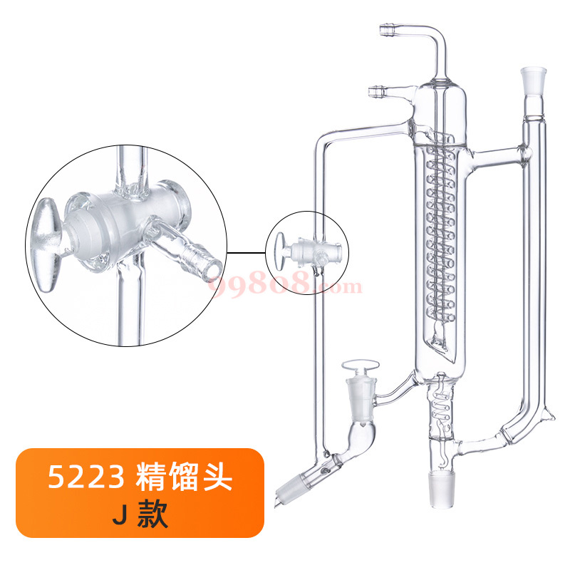 该蒸馏头结构紧凑,蒸汽上升管具保温盖,可以在减压情况下调换接受瓶,特别适合于分馏含有水份的物质,全部为标准口。主塞编号*边塞编号*边口编号。
