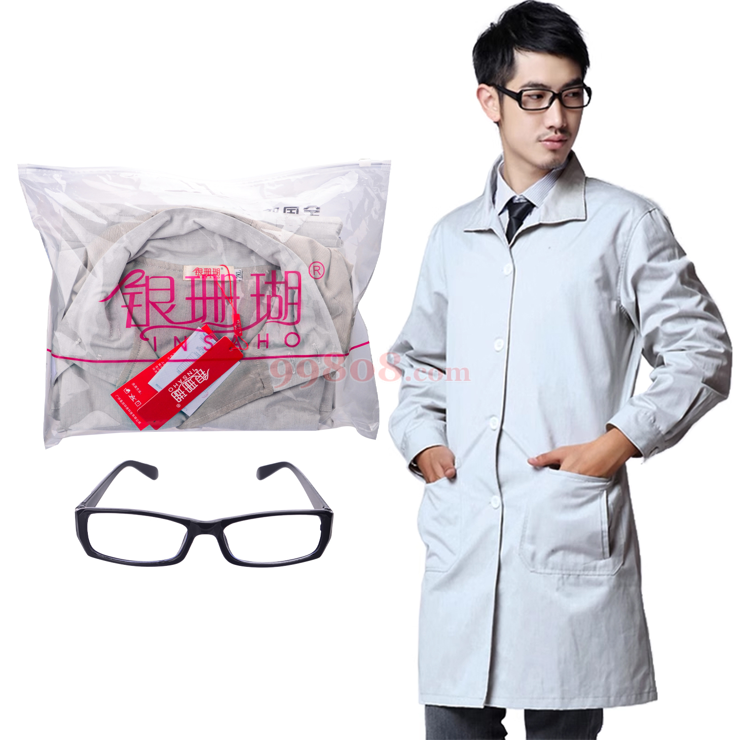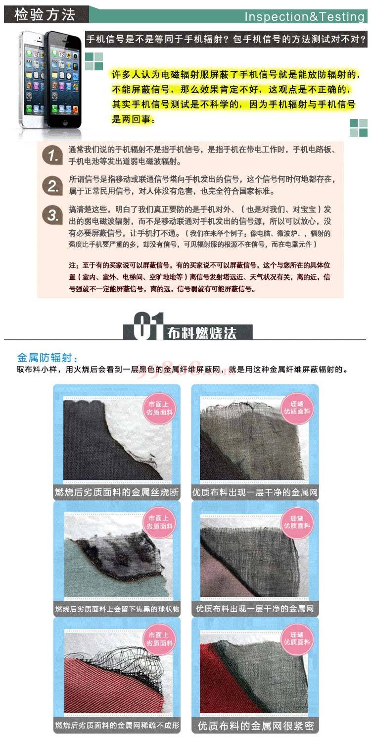 面料:外层 金属纤维防辐射面料;里层 60%银纤维防辐射面料 强辐射环境防护工作服。屏蔽效能大于65DB。屏蔽频带:10M-7000MHZ。适合人群:适用于长时间工作生活在电磁波频率较大区域的人群。如电脑、复印机、电子医疗设备、电子发射转接的工作人员、电台、电信、通讯、机房工作人员。