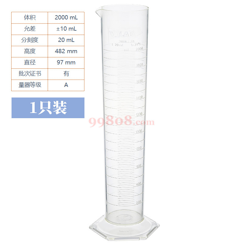 VITLAB | 塑料刻度量筒A级(PMP)KB证书 | 2000mL ±10mL
